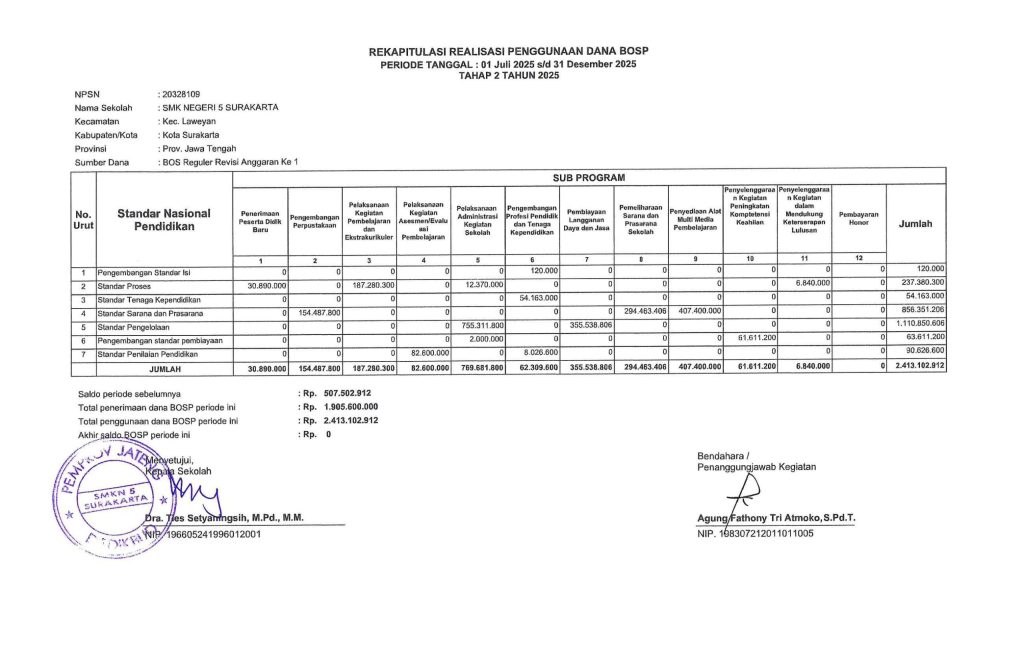 Rekapitulasi Realisasi Penggunaan Dana BOSP Tahap 2 Tahun 2025 SMK NEGERI 5 SURAKARTA